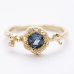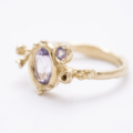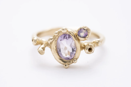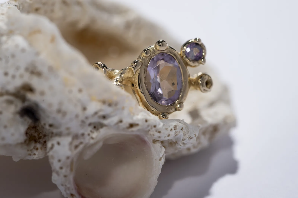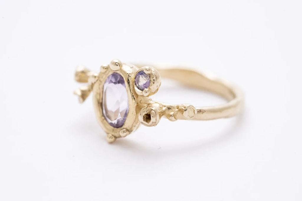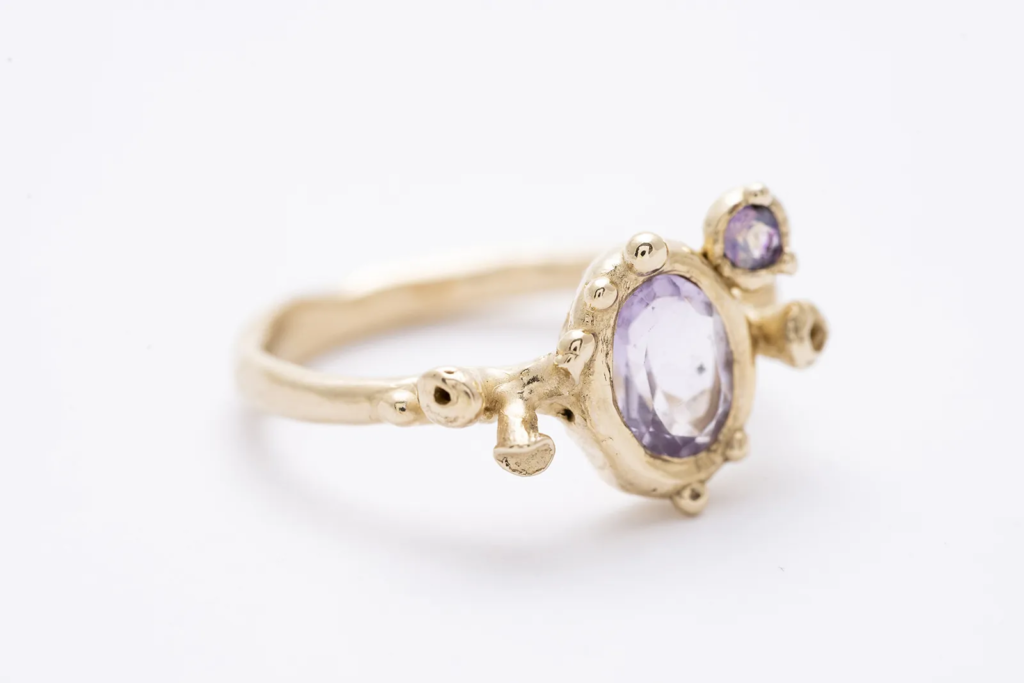 A gyűrű 14 karátos aranyból készült, gondos kézműves munkával. Az organikus, enyhén szabálytalan formák és a finom részletek egyediséget adnak minden darabnak. Az arany meleg fénye tökéletesen kiemeli a kövek színét és ragyogását, így ez az arany ékszer egyszerre elegáns és különleges.