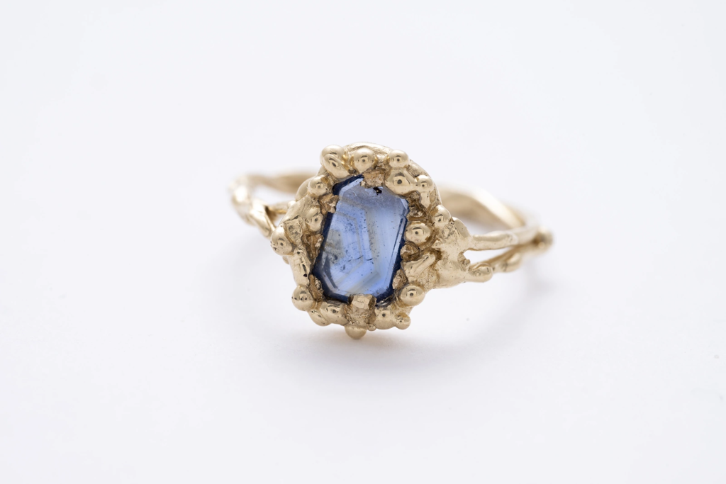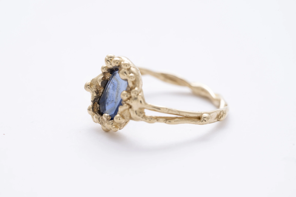 anyag: 14 karátos sárga arany, portrait cut zafír