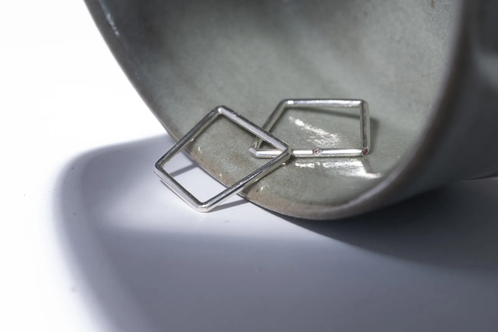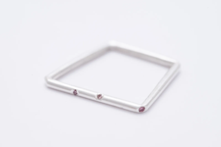 A gyűrű különlegességét 3 darab rózsaszín gyémánt adja, amelyek lágy, nőies fényükkel teszik igazán egyedivé az ékszert. A gyémántok visszafogottan ragyognak a szögletes forma kontrasztjában, így a sterling ezüst ékszer egyszerre modern és elegáns.