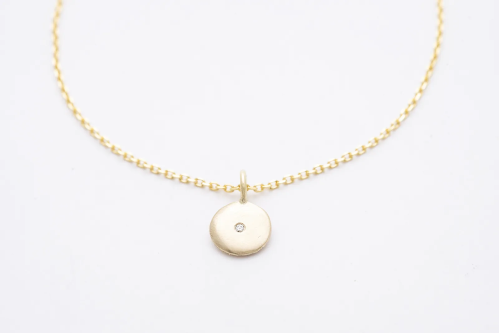 A nyaklánc medáljában egy ragyogó fehér gyémánt kapott helyet, amely tiszta fényével és időtlen szépségével az ékszer fénypontja. A gyémánt finom csillogása elegáns kontrasztot alkot a 14 karátos arany meleg árnyalatával, így a nyaklánc egyszerre klasszikus és modern hatást kelt.