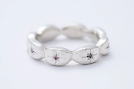 Az ezüst gyűrű különlegességét 8 db rózsaszín zafír adja, amelyek csillag alakú vésetekben kaptak helyet. Ezek az apró, ragyogó kövek lágy fényt visznek az ékszerbe, mintha egy csillagos mediterrán égbolt elevenedne meg az ujjon. A rózsaszín árnyalat finoman nőies, mégis karakteres, így a gyűrű tökéletes kiegészítője a modern nő megjelenésének.
