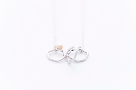 Three-dimensional hexagon shapes create the beehive-like structure of the COLMENA necklace, accented by a 14K yellow gold bauble that symbolises a bee.