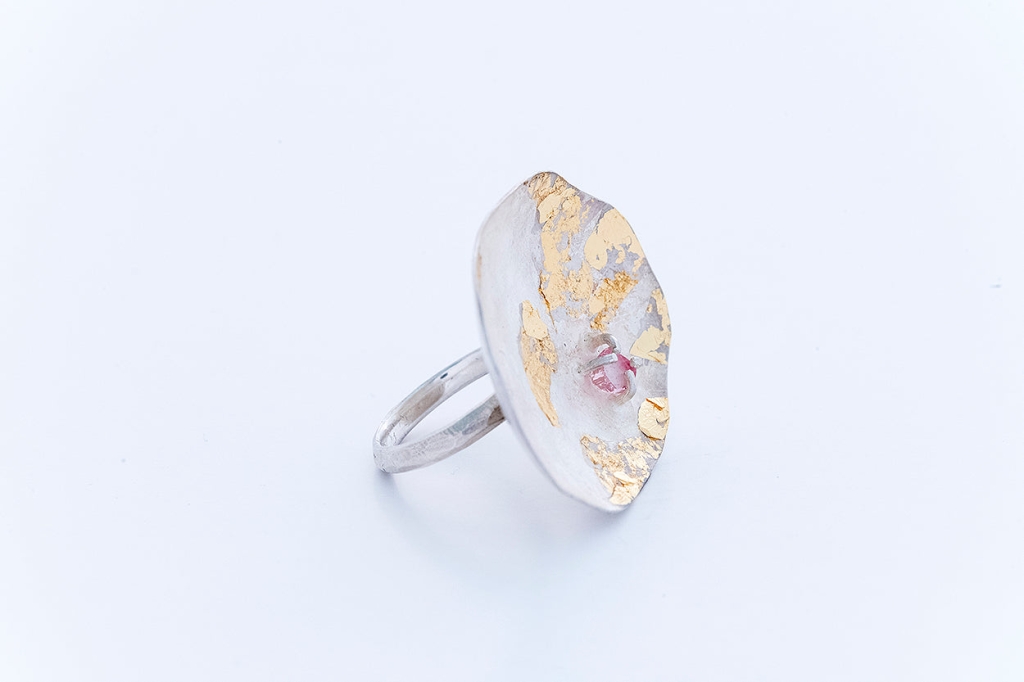 The beautiful combination of Sterling Silver, Burmese gold leaf and raw pink tourmaline gives this ring a stunningly gorgeous, art piece vibe.